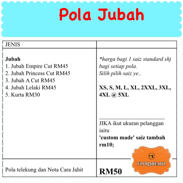 Selembar sudah ada 5 macam size dari s sampai xxl . Pola bagi umur 6 bulan hingga 5 tahun boleh didapati dengan harga rm7.